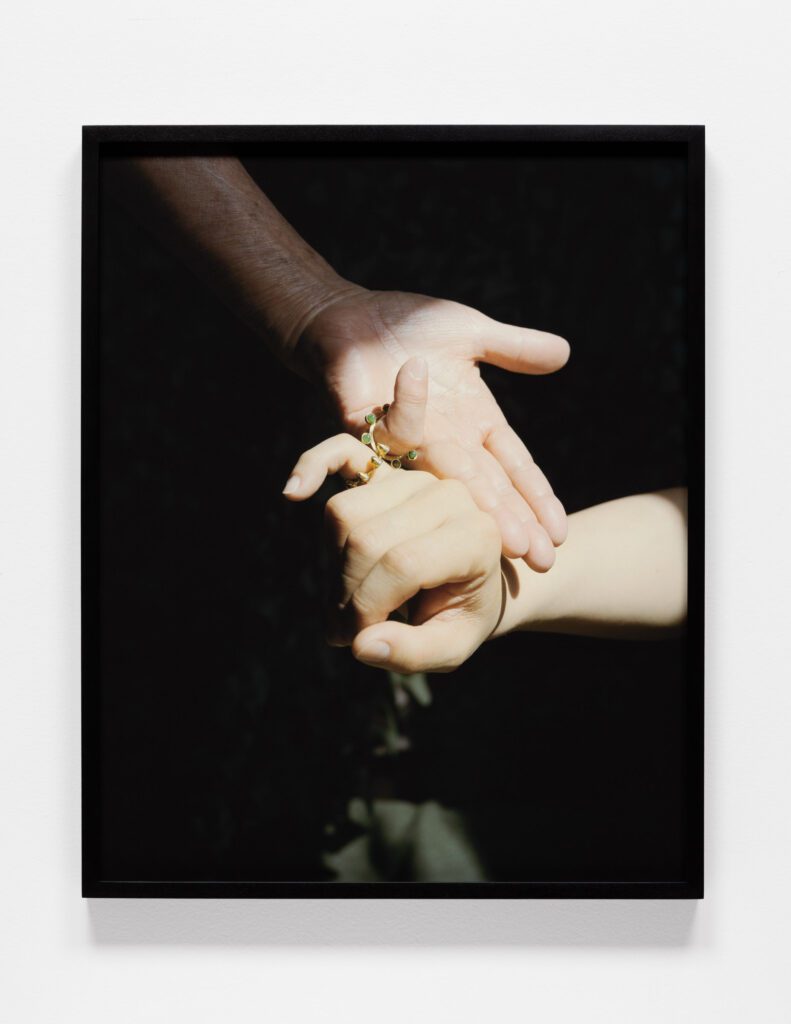 In Handy Work, Steven Beckly’s third solo exhibition with Daniel Faria Gallery in Toronto, the artist turns dramatically staged elements of light and form inward. Known for his sensually evocative, sculptural approach to photo-based installations, the artist returns to the self-contained image in a series of wall-mounted and framed photographs of hands holding, twisting, grasping, and gripping each other in a series of intimate gestures. In the photographs, the hands appear as dramatic figures, lit by direct sunlight in a dramatic chiaroscuro effect against their shadowy backdrops. Amidst a layered background of camouflage-printed fatigues, military-grade wool, and army-green netting, Beckly’s hands deftly weave a rich semiotic history of his Vietnamese Chinese family’s past.