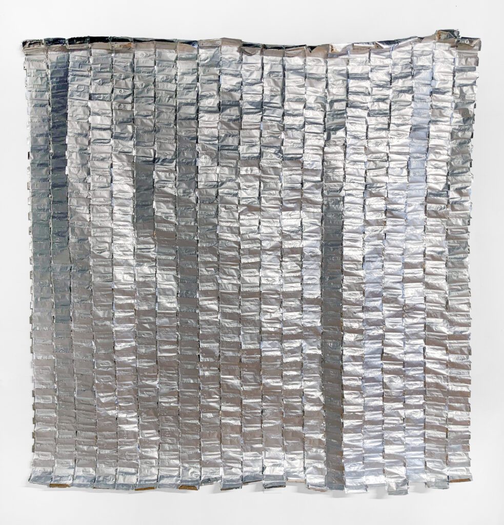 JP: That evasive strategy is definitely a familiar experience for me. It’s a different kind of perspective on how you’re reading space or reading the environment, scanning for threats, and deciding how much to blend in or stick out. I think camouflage is an interesting way of talking about that sort of experience. I was thinking about that in my own work, Space Blanket (2019-ongoing), which is included in Sympathetic Lightning (the show that you and Nirvana curated). Space Blanket is a work that’s made of testosterone gel packets, which are cut open and then stitched together into a large quilt. The exterior looks like an emergency blanket, one of those single-use, highly reflective blankets used for emergency shelter and warmth in the backcountry, or for treating people in shock after a disaster or a marathon. In this artwork, there’s a relationship with camouflage, emergency response, safety, transformation, and visibility. As an object, a space blanket obscures the wearer by reflecting the world around them. I see this as coming at camouflage in a resonating, but distinct vein from your own work. There’s so much that can be said about how, where, and when we camouflage, and the intelligibility of that act in different contexts.