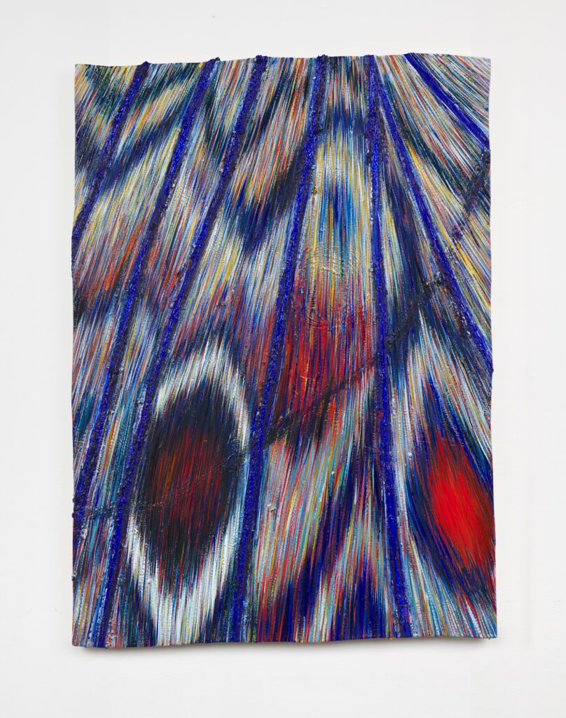 JP: You describing them as just rolling around the gallery is kind of delightful because it brings this other layer of perspective, a physical engagement and interaction with your work. I’m also thinking about how the picture plane gets disoriented in your drawings and paintings, so you have eyeballs that are kind of rolling around on these different planes. It’s interesting seeing similar forms pop up in these different works, it makes the space behind the painting feel like it continues outside of the frame.