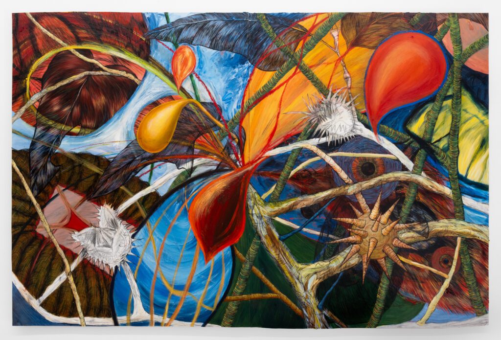 I first met Sarah Davidson during a queer ecology-themed Banff Centre residency in 2022, where we bonded over our love of hiking, literature, and our mutual interests in queerness beyond the human variety. Throughout our time there, we spent many days out of the studio walking up various mountains and talking about drawing, writing, and being trans in different spaces. Davidson’s practice exists within the genres of painting and drawing, and weaves figurative elements of the natural world together with a rigorous illustrative hand that blends into colourful biomorphic abstraction, complicating the boundaries between bodies, organisms, and forms. This conversation took place in the spring of 2025, while their solo exhibition, Blending In, was on view at Auxier Kline in New York, as well as a group show called Sympathetic Lightning, which was co-curated by Davidson and Nirvana Santos-Kuilan at Springs Projects. My work was included in Sympathetic Lightning, though myself and several other artists in the show were unable to visit the show in the US due to shifting policies around transness and identification at the border. Davidson and I recently joined in conversation to reflect on how understandings of transness and queerness have shifted in the last several years, what art can offer in these re/interpretations, and how in these times, looking for survival strategies from the more-than-human is more resonant than ever.