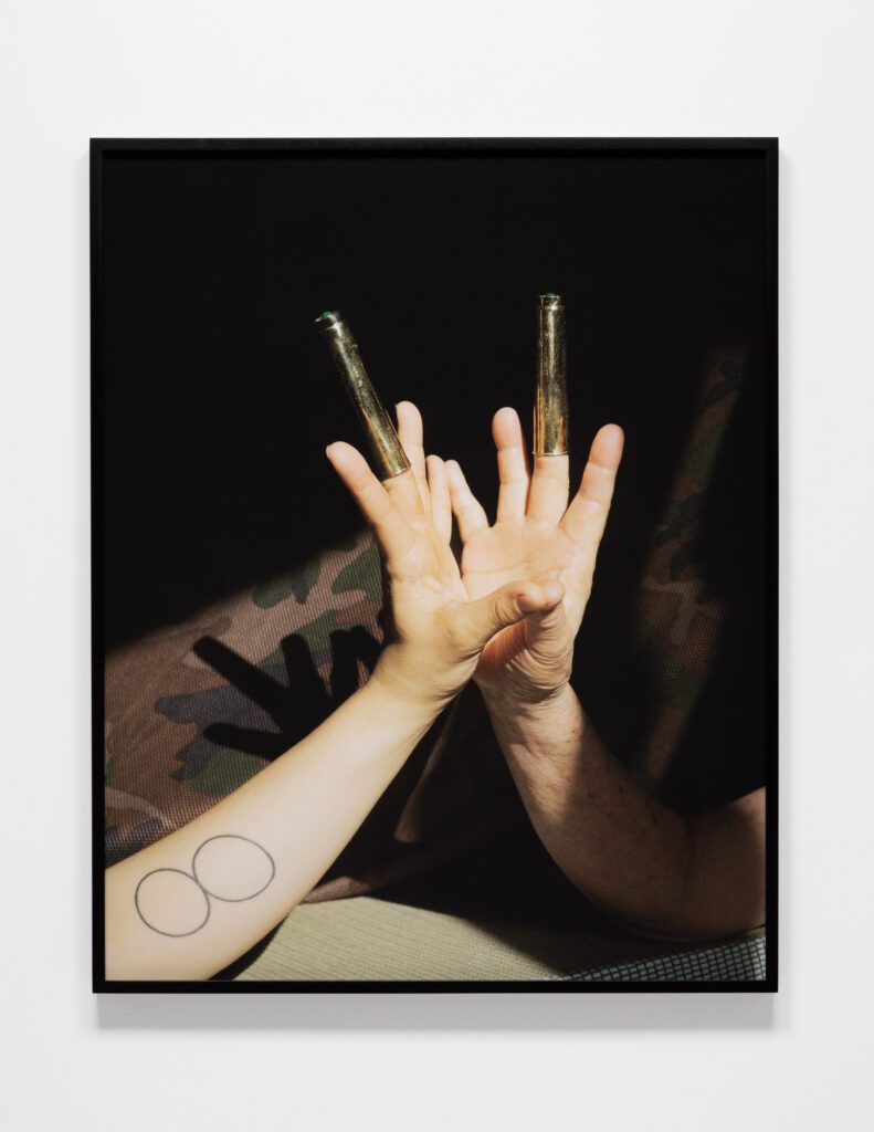 In Handy Work, Steven Beckly’s third solo exhibition with Daniel Faria Gallery in Toronto, the artist turns dramatically staged elements of light and form inward. Known for his sensually evocative, sculptural approach to photo-based installations, the artist returns to the self-contained image in a series of wall-mounted and framed photographs of hands holding, twisting, grasping, and gripping each other in a series of intimate gestures. In the photographs, the hands appear as dramatic figures, lit by direct sunlight in a dramatic chiaroscuro effect against their shadowy backdrops. Amidst a layered background of camouflage-printed fatigues, military-grade wool, and army-green netting, Beckly’s hands deftly weave a rich semiotic history of his Vietnamese Chinese family’s past.